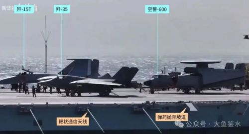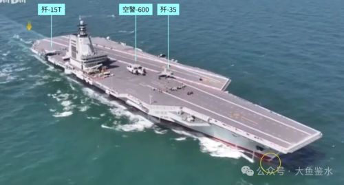 此时前甲板弹射器后面只有歼-35和空警-600,歼-15T停放在后甲板上。