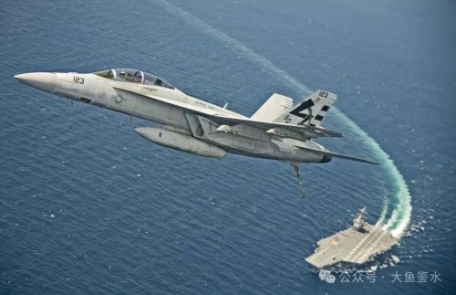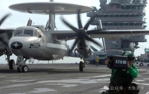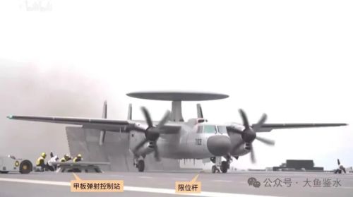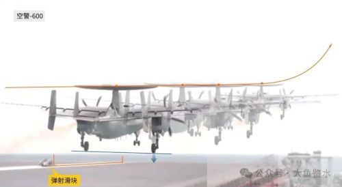 以E-2C顶部的CEC天线座为基点连线,在飞越甲板前端时飞机明显有一个下跌的动作,主轮高度几乎和甲板平行,然后再向右侧偏转爬升,显得较吃力。看了好几个E-2弹射的视频基本都是这样。