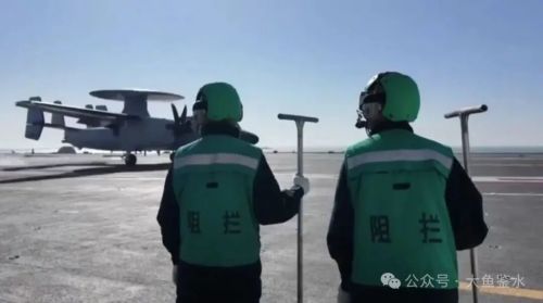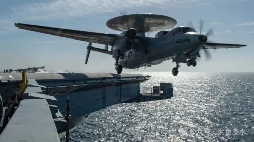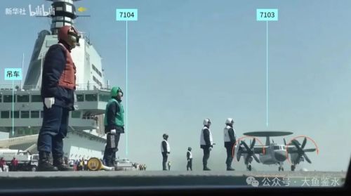 从舰艏方向看滑行中的7103号机,舰岛后侧可以看到第3架7104号机,这里是美国航母通常停放预警机的位置。加上前面的7106号机,此时甲板上只有3架空警-600,说明是在进行空警-600的起降作业专项测试。可以看到空警-600螺旋桨转动的方向(朝桨叶的“刀刃”方向转)是顺时针,下图E-2C是逆时针。