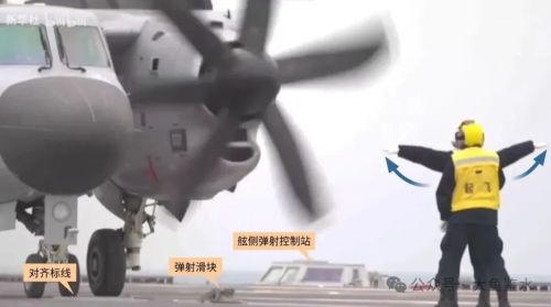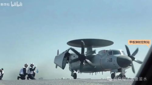 画面一转两架战斗机都不见了,整个前甲板空空荡荡只剩下一架空警-600和1、2号弹射器之间的一辆牵引车。空警-600已经停在2号弹射器后方,螺旋桨在高速运作,机轮没有系留索固定,正在自动展开机翼,已经进入弹射程序。这个场景和前一个画面是不同时间拍摄的,空警-600的首次弹射测试应该就是这种样子。