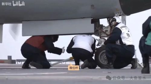 进行地面弹射测试的F-35C前轮结构,不同机型采用不同颜色的限位杆加以区分。牵引杆前端涂有指示性的黑漆,当挂入黑色弹射滑块前端的凹槽时,底部的弧度和弹射滑块顶部形状相同,如果连接后露出了下面的白漆说明挂钩位置不正确,我们的牵引杆上没看到这个简单但实用的设计。