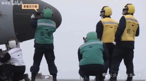 上图最前面2名黄马甲是弹射指挥员(央视记者解说叫起飞助理),绿马甲是弹射操作员,蹲在前起落架旁的是安全检查员。最引人注目的是左边这位绿马甲,他手里拿着的是重量显示器,向飞行员显示起飞重量(画面中反拿重量数据面向他自己)。读数似乎是032,单位为吨?如果是这个重量的线吨。