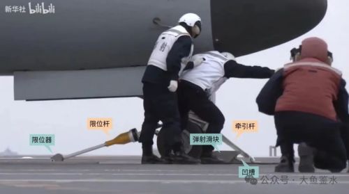 白马甲打手势指挥飞机向前移动,当牵引杆越过弹射滑块前部之后会下落到弹射器表面,然后滑块前移让牵引杆前端卡入凹槽,完成挂钩。红马甲是安全员,从后面跑到前面观察确认前后挂钩成功。当滑块将牵引杆张紧时,前起落架支柱将被缩短一段距离,机身下沉;弹射脱钩后支柱向上反弹伸长,将赋予飞机一定的仰角帮助升空。