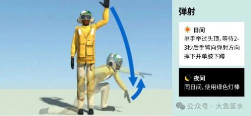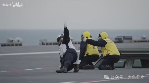 和美国弹射军官半蹲的“开火”姿势相比,我们的起飞助手采用全蹲且后腿膝盖着地,支撑面积大,身体更稳固。