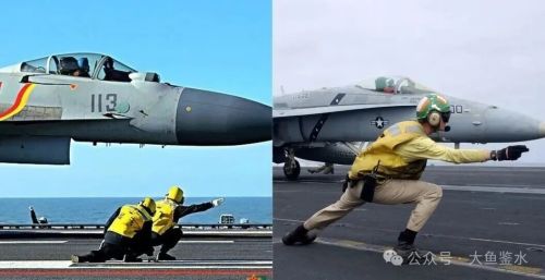 (视频的顺序有点乱,把这3张图提前讲)黄马甲是尾钩观察员,他站在触舰点附近,高举双手示意挂钩成功。如果发生脱钩或者阻拦索被拉断等意外情况,他可以在最近距离内观察到并发出报警手势,左侧LSO平台上的着舰信号官将立即发出复飞信号,飞行员打开加力拉起飞机。