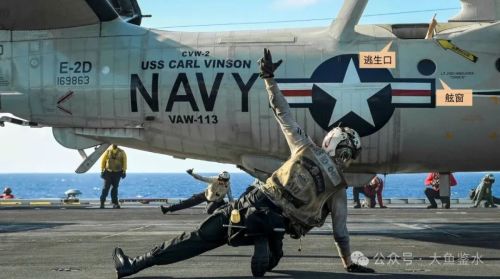 2024年7月15日,“卡尔·文森”号准备弹射起飞一架E-2D,一位机组从逃生口伸出手示意准备完毕。