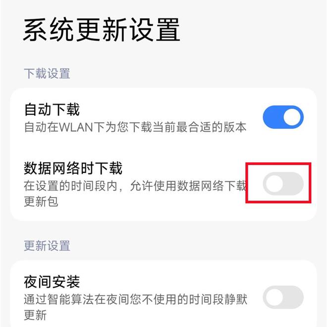 手机系统更新,分大更新和小更新,如果是小更新一般几十兆,大更新就需要几个G了,如果咱们没注意,没有把流量关掉,一旦进行更新了,那咱们的流量也会被消耗不少,所以我们要把在夜间更新和使用流量更新开关关掉,把仅在wifi下更新打开就可以了!