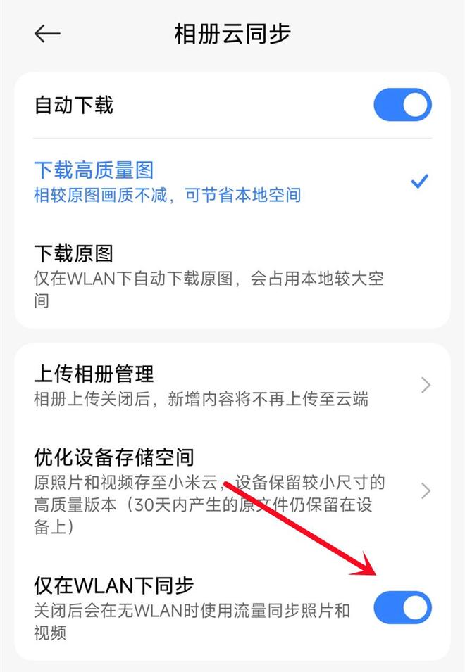 打开【设置】→ 找到【云服务】→ 点击【照片/视频同步】→ 关闭“移动网络下同步”,只保留“仅在WLAN下同步”即可。